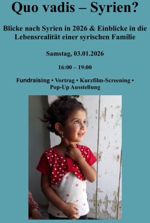 - 17 Uhr Vortrag und Diskussion: Aktuelle politische und humanitäre Lage in Syrien – Hintergründe, Entwicklungen und Perspektiven